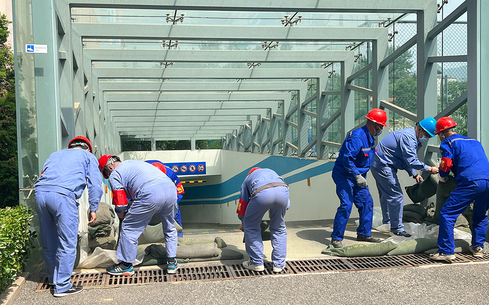 “收到,目前正安排各應(yīng)急救援小組人員趕赴現(xiàn)場,設(shè)置警戒線、檢查雨水井是否堵塞、啟動集水池排水泵、地庫入口碼放沙袋......”這是京西熱電防汛應(yīng)急演練場景,演練人員手持沙袋,快速向事故現(xiàn)場集結(jié)。